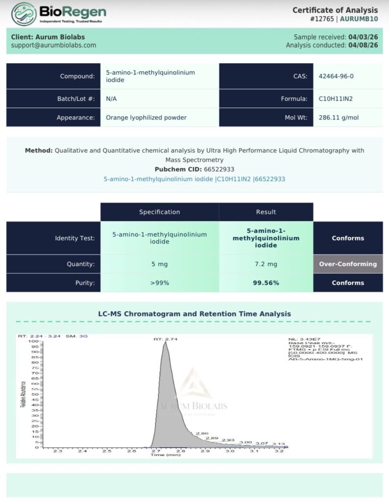 5-Amino-1MQ functions as an NNMT inhibitor, which may influence intracellular NAD+ levels and methylation balance. Research involving 5-Amino-1MQ typically focuses on understanding its effects on metabolic efficiency, fat storage mechanisms, and overall cellular energy homeostasis. It is frequently explored in experimental models related to obesity, metabolic disorders, and aging.